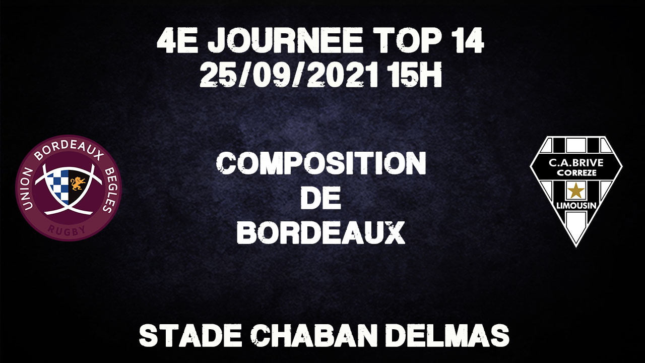 Pour cette réception de Brive, Bordeaux ne peut compter sur Gimbert (genou), Tabidze (cheville), Cobilas (malade), Cros (genou), Lachaise (genou), Roumat (ischios), Ducuing (mollet), Dweba (sélection Afrique du Sud), Petti et Cordero (sélection Argentine).