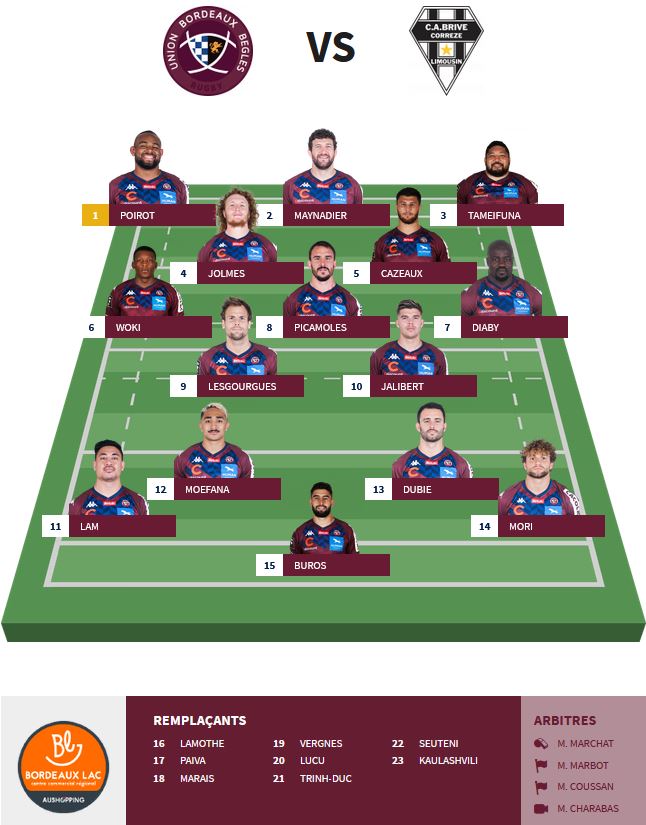 Pour cette réception de Brive, Bordeaux ne peut compter sur Gimbert (genou), Tabidze (cheville), Cobilas (malade), Cros (genou), Lachaise (genou), Roumat (ischios), Ducuing (mollet), Dweba (sélection Afrique du Sud), Petti et Cordero (sélection Argentine).