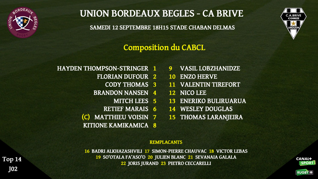 Pour ce déplacement, Brive apporte de nombreux changements à son XV de départ. Hayden Thompson-Stringer échange sa place avec Simon-Pierre Chauvac. Cody Thomas est titulaire à droite. Matthieu Voisin et Kitione Kamikamica sont titulaires en 3e ligne. Thomas Laranjeira retrouve sa place à l'arrière. Brandon Nansen, Valentin Tirefort et Wesley Douglas vont connaitre leur première titularisation avec le CAB.