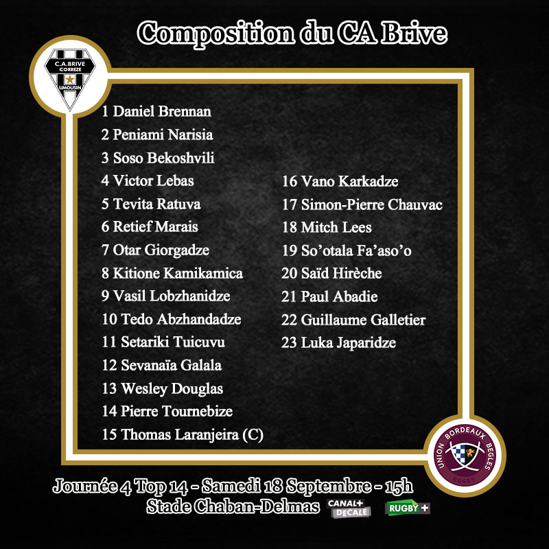 Voici le XV de départ du CA Brive pour le déplacement à Bordeaux :