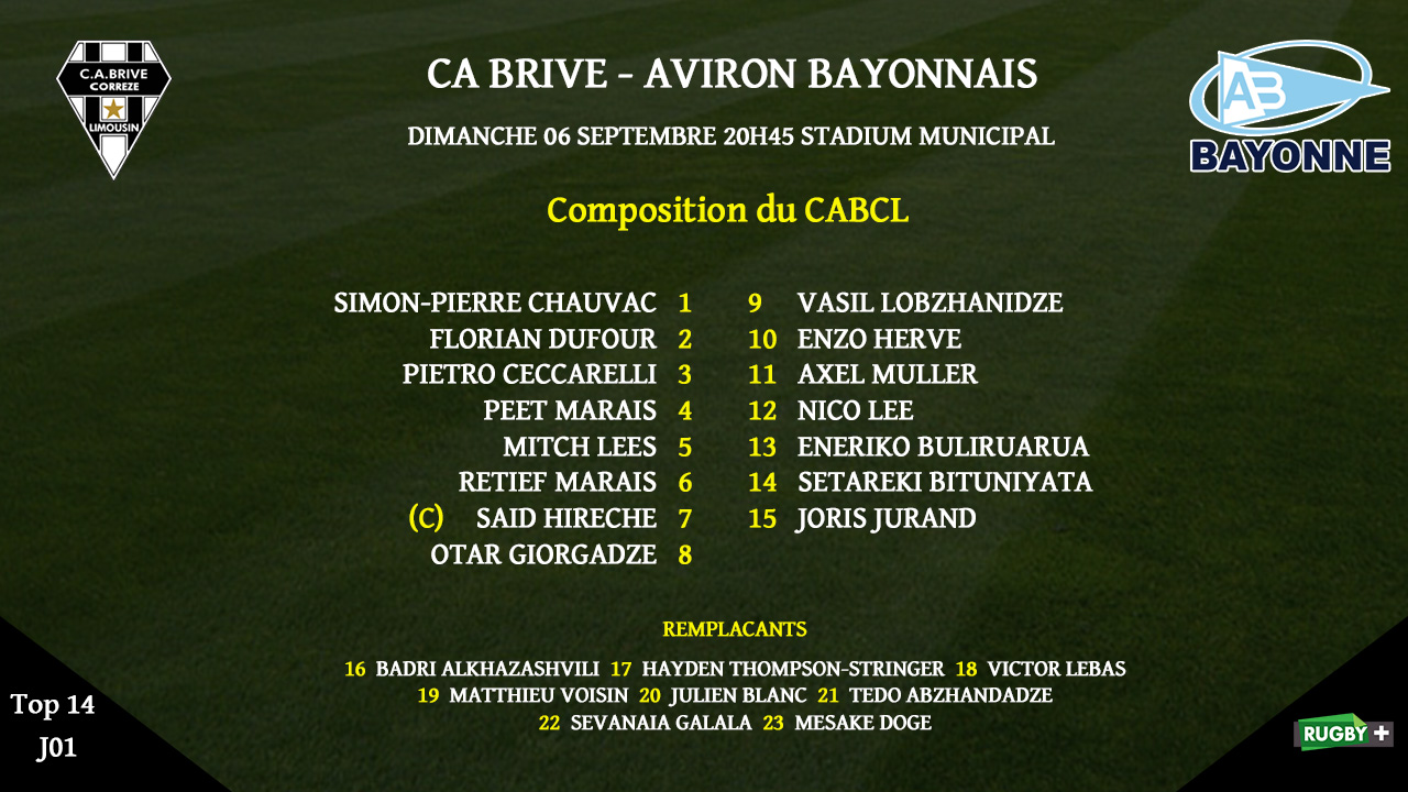Pour cette réception, le XV de départ de Brive fait confiance à la plupart des titulaires de la saison dernière. Deux recrues vont débuter officiellement avec le CAB : Florian Dufour et Pietro Ceccarelli. En l'absence de Thomas Laranjeira, c'est Joris Jurand qui sera à l'arrière et Setareki Bituniyata à l'aile. Badri Alkhazashvili, tout juste arrivé, sera remplaçant au talonnage.