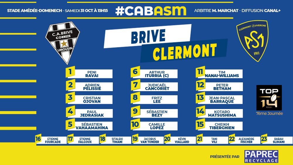 Voici le XV de départ de Clermont pour le déplacement à Brive :