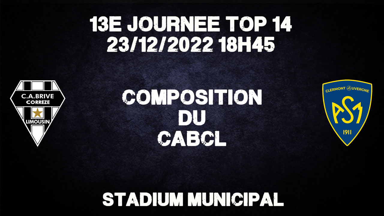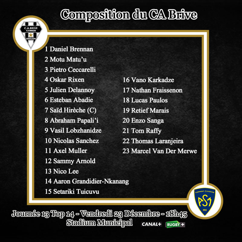 Pour cette réception, Brive revient à quelque chose de plus classique. Daniel Brennan, Motu Matu'u et Pietro Ceccarelli forment la première ligne. Derrière, on retrouve Julien Delannoy et Oskar Rixen. Saïd Hirèche est avec Esteban Abadie et Abraham Papali'i en 3e ligne. Charnière Vasil Lobzhanidze - Nicolas Sanchez pour mener le CAB. Comme face au Connacht, Sammy Arnold et Nico Lee sont au centre. Axel Muller, Aaron Grandidier-Nkanang et Setariki Tuicuvu forment le trident arrière.