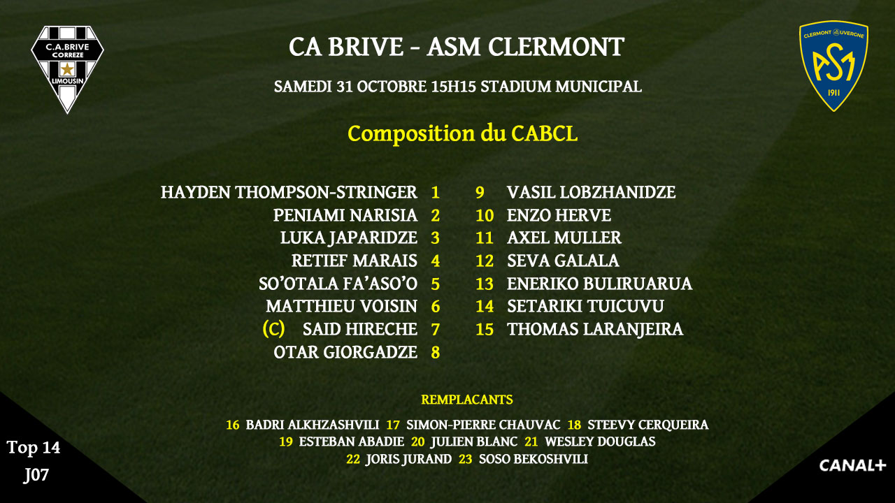 Pour cette réception, Brive revient à une composition qui se rapproche de son XV habituel. Peniami Narisia poursuit au poste de talonneur. La 2e ligne est surprenante avec Retief Marais et So'otala Fa'aso'o. Said Hirèche, Matthieu Voisin et Otar Giorgadze sont en 3e ligne. De retour de sélection, Vasil Lobzhanidze sera à la mêlée. Eneriko Buliruarua et Seva Galala sont au centre tandis qu'Axel Muller, Setariki Tuicuvu et Thomas Laranjeira complètent la ligne de 3/4.