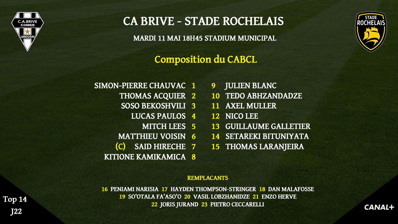 Pour cette réception, Brive amène du sang neuf à l'équipe qui a peiné samedi face au Stade Français. Simon-Pierre Chauvac et Soso Bekoshvili échangent leurs places avec Hayden Thompson-Stringer et Pietro Ceccarelli. Thomas Acquier est titulaire au talonnage. Matthieu Voisin retrouve l'équipe en tant que titulaire. Plutôt à l'aise en sortie de banc, Julien Blanc et Tedo Abzhandadze sont titulaires à l'ouverture. Guillaumen Galletier est titulaire au centre. Thomas Laranjeira retrouve son poste d'arrière. Enzo Hervé revient sur le banc.