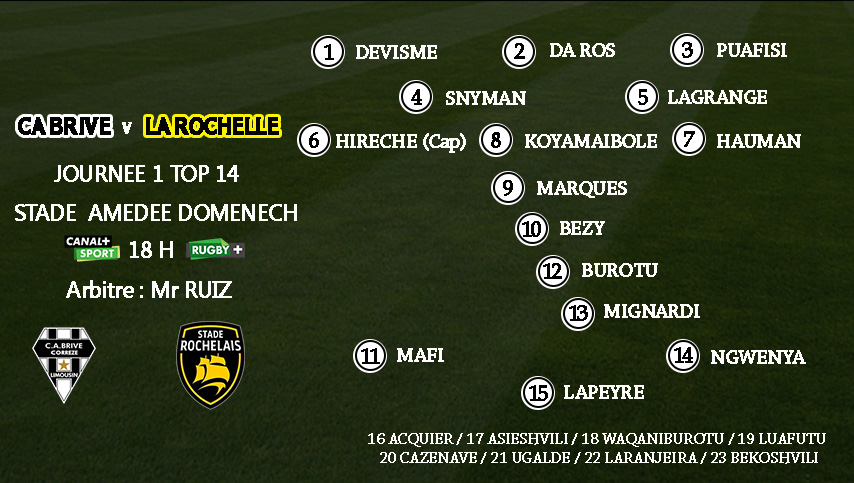 Pour cette première réception, Brive est dans du classique par rapport à la saison dernière avec 3 recrues possiblement titulaires : Sila Puafisi, Damien Lagrange et Samuel Marques. Gaëtan Germain est forfait, remplacé à l'arrière par Benjamin Lapeyre.
