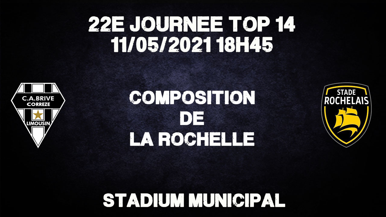 Pour le déplacement à Brive, La Rochelle est privée de Botia (cheville), Alonso Munoz (épaule), Leroux (cheville), Herrera (épaule), Sinzelle (genou) et Bourdeau (genou). Les cadres de l'équipe (Atonio, Bourgarit, Sazy, Skelton, Alldritt, Vito, Kerr-Barlow, West, Rhule, Doumayrou, Dulin, Priso, Gourdon) sont au repos.