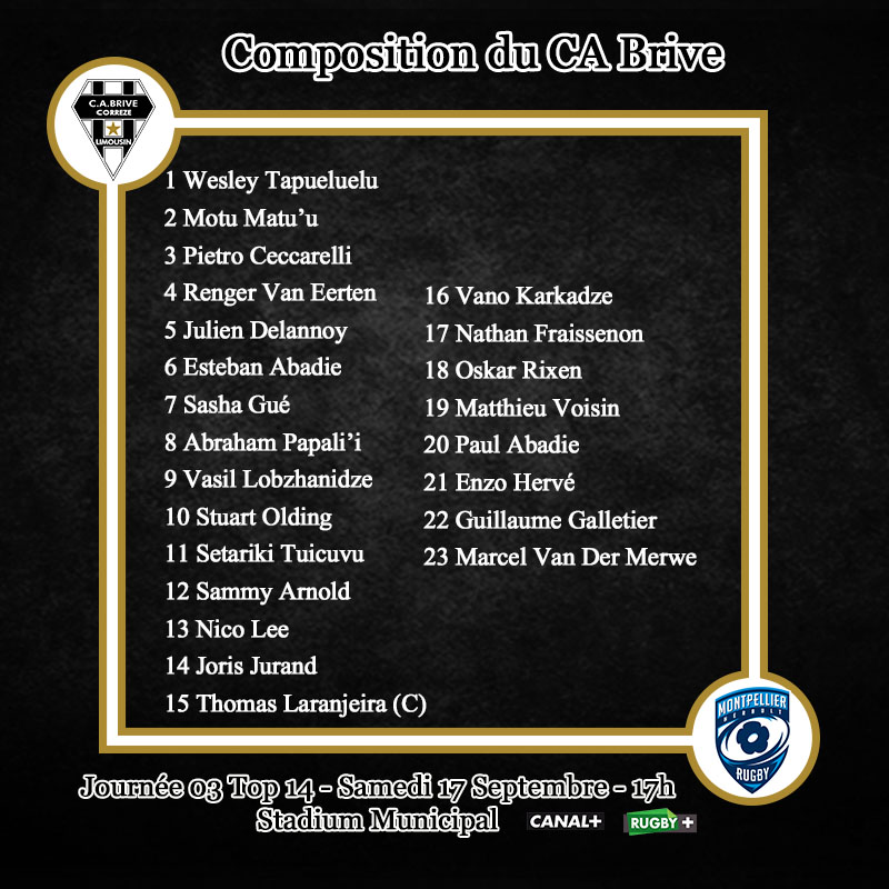 Voici le XV de départ du CA Brive pour la réception de Montpellier :