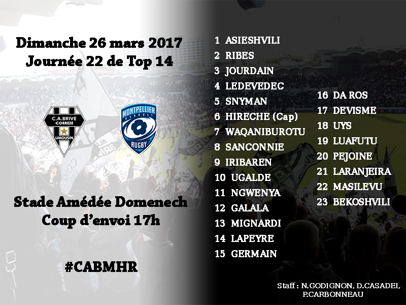 Voici le XV de départ du CA Brive pour la réception de Montpellier :