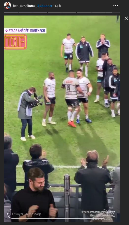 Ce vendredi soir, en plus des supporters présents au stade et de ceux devant leur écran, deux supporters de choix étaient au soutien : Cécile Grès (de retour de sa journée à Roland Garros) et le pilier bordelais Ben Tameifuna (venu encourager ses amis So'otala Fa'aso'o, Matthieu Voisin et Hayden Thompson-Stringer)