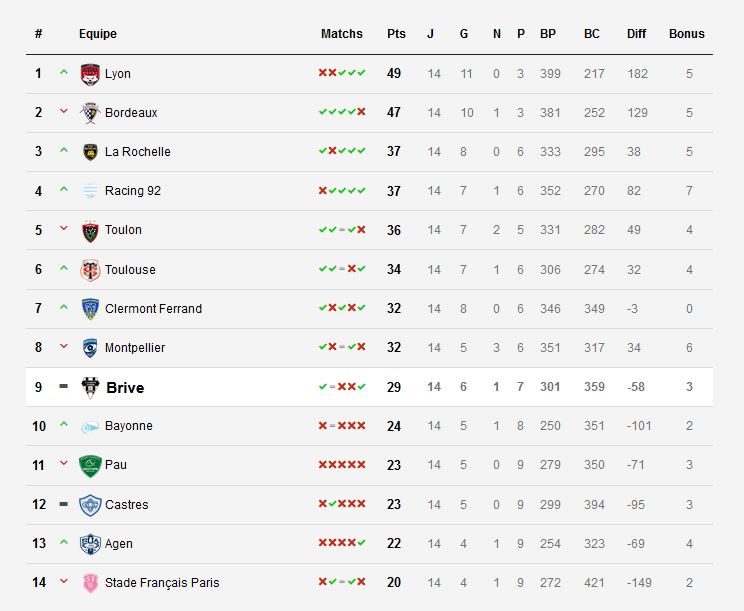 Au classement, Brive a fait un petit trou sur le bas du classement mais il faudra faire mieux dans les prochaines semaines pour le conserver et surtout l'améliorer.