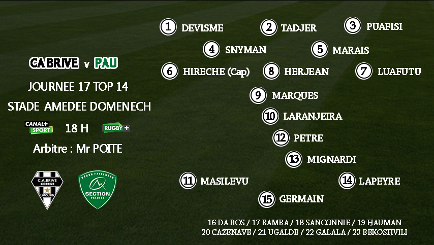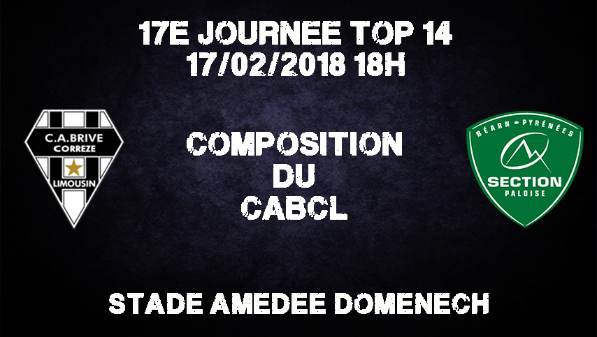 Pour cette réception, Brive garde la majorité de l'équipe de départ à La Rochelle. Il y a 5 changements avec Vivien Devisme et Johan Snyman titulaires devant ainsi que Samuel Marques et une nouvelle paire de centres pour la ligne de 3/4.