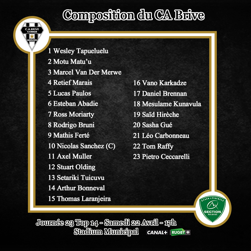 Pour cette réception, Brive peut compter sur le retour de suspension de Marcel Van Der Merwe. Wesley Tapueluelu est titulaire à gauche. Retief Marais monte en 2e ligne. Ross Moriarty vient densifier la 3e ligne. Stuart Olding débute au centre. Axel Muller retrouve une place de titulaire. Mathis Ferté est à la mêlée tandis que Thomas Laranjeira est à l'arrière. A noter le capitanat pour Nicolas Sanchez.