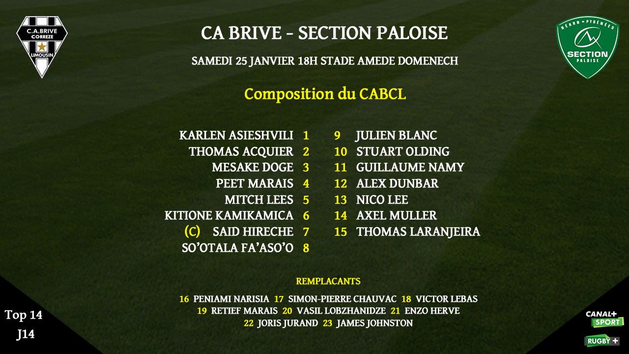 Pour cette réception, Brive récupère plusieurs joueurs. Une toute nouvelle première ligne est alignée par rapport à Montpellier avec Karlen Asieshvili, Thomas Acquier et Mesake Doge. Peet Marais retrouve Mitch Lees en 2e ligne. Stuart Olding est de retour à l'ouverture et va former la charnière avec Julien Blanc. Guillaume Namy et Alex Dunbar sont titulaires dans la ligne de 3/4 tandis que Thomas Laranjeira retrouve sa place à l'arrière.