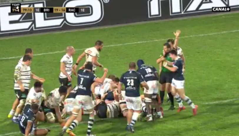 Malheureusement derrière, la mêlée du CAB est à la faute, offrant une pénalité à François Trinh-Duc qui la réussit (19-16, 67'). On entre dans le "money-time" et cela peut basculer d'un côté comme de l'autre. Et la réussite continue de fuir les brivistes. Sur une action défensive, Axel Muller se blesse à la jambe (genou, cheville ?) et doit quitter le terrain porté par le staff médical (69'). Le Racing entre dans sa période favorite et fait l'effort sur chaque phase de conquête, mêlée et maul, et pousse à la faute les brivistes. De retour dans les 22 du CAB, le Racing 92 va chercher la victoire et opte pour la pénaltouche mais l'alignement contre le lancer et Brive peut se donner de l'air. Pas pour longtemps car ça revient vite, trop vite. Brive est à bout de souffle alors que les racingmen sont en train de produire leur effort, comme au Stade Français ou face à Pau. Nouveau maul des visiteurs qui avance jusqu'à la faute briviste. C'est un dernier avertissement avant un carton jaune (76'). Nouvelle touche et nouveau maul mais la défense ne se met pas à la faute et contre l'avancée du maul. Le ballon étant enterré, Brive gagne le ballon mais devra bien négocier cette mêlée à 5 mètres. Quand on connait la faiblesse de Brive dans ce secteur, tout le monde tremble chez les supporters. Et malheureusement, Brive est à la faute sur cette ultime mêlée. Après le choix de la touche, on opte pour du jeu à la main. Clairement, c'est la victoire ou rien d'autre. Le Racing 92 pilonne la ligne, Brive défend avec toute la volonté du monde mais ça finit par craquer à quelques secondes de la sirène. Et comme face à Pau il y a une semaine, c'est Fabien Sanconnie qui offre la victoire au Racing 92 et du fait, qui prive son club formateur de cette victoire (19-23, 80'). Brive était tout proche d'une grosse victoire collective mais il ne restait plus grand chose dans le réservoir depuis de trop longues minutes. Pour la 3e fois en 4 matchs, le Racing 92 décroche une victoire dans les dernières minutes du match. Spécialité racingman.