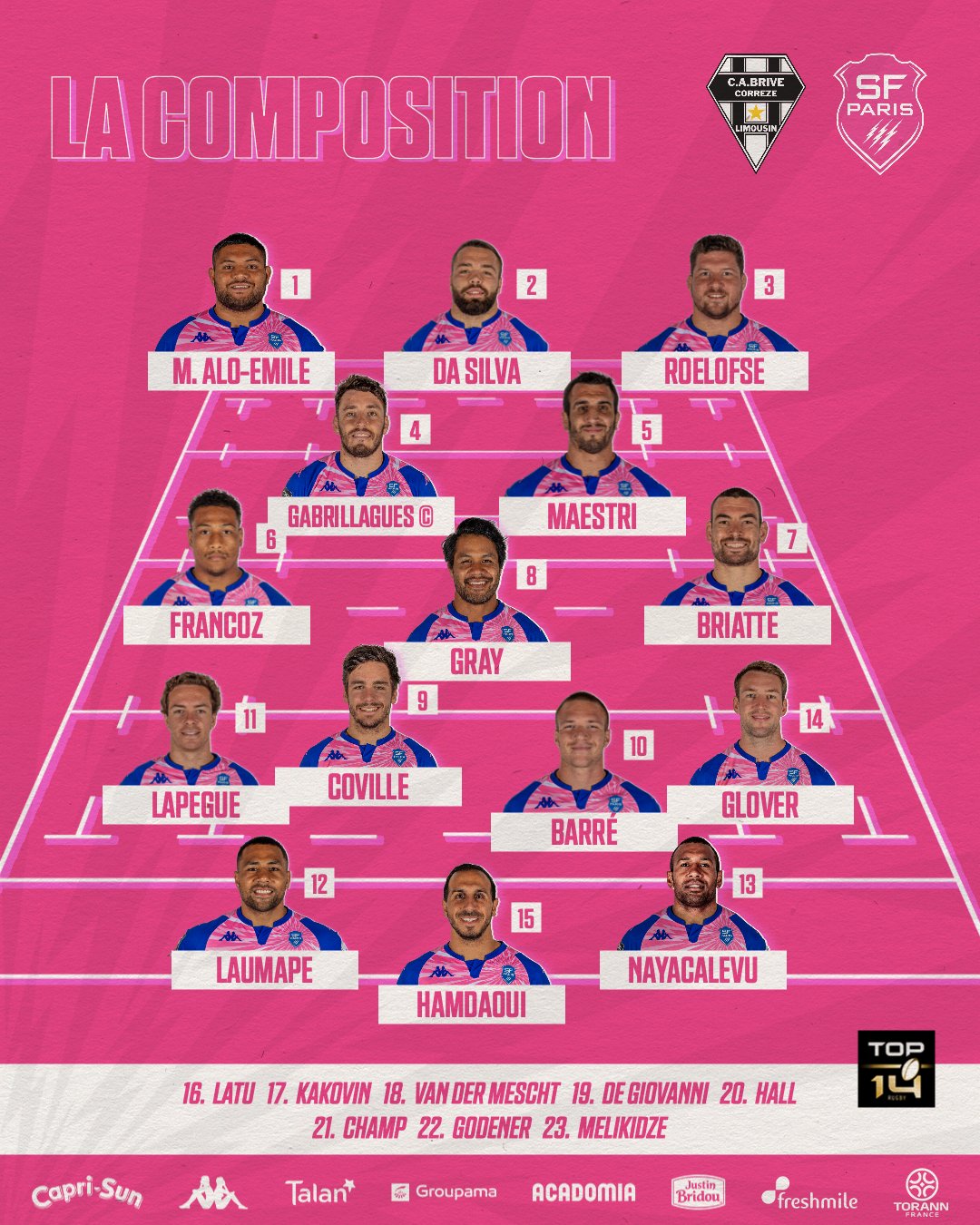 Pour ce déplacement à Brive, Paris sera privé de P.Alo Emile (suspension), Naivalu (pied), Delbouis (genou), Etien (tendon d'Achille), Castets (genou), Segonds (ischios), Macalou (talonnade), Arrate, Bethune, Burban (dent), Kremer et Sanchez (sélection Argentine).
