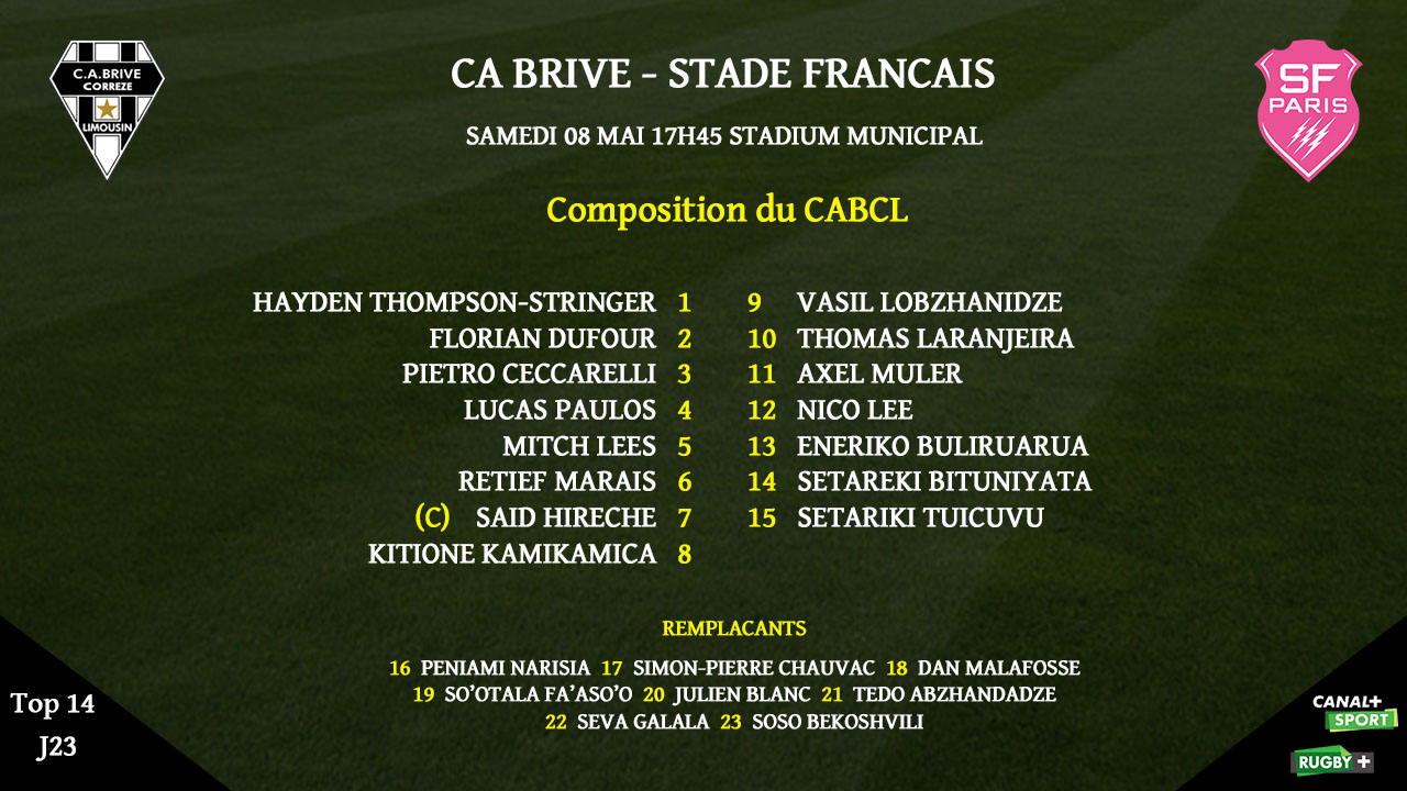 Voici le XV de départ du CA Brive pour la réception du Stade Français :