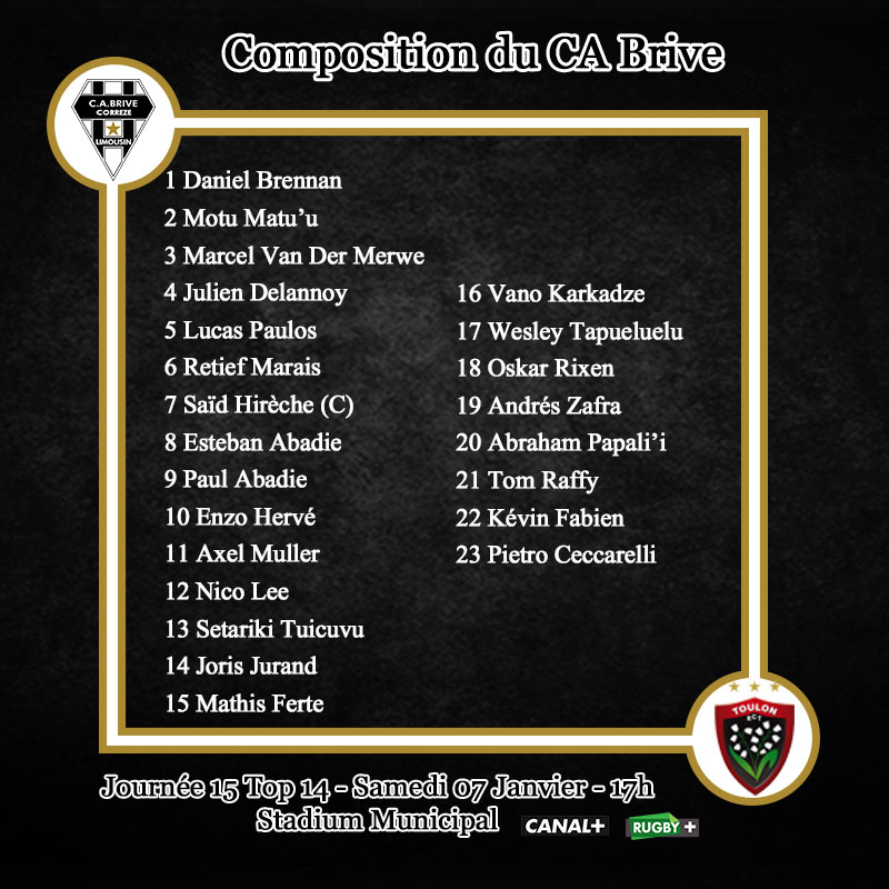 Voici le XV de départ du CA Brive pour la réception de Toulon :