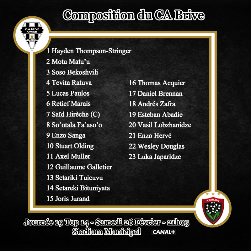 Voici le XV de départ du CA Brive pour la réception de Toulon :