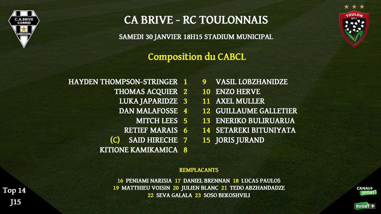 Voici le XV de départ du CA Brive pour la réception de Toulon :