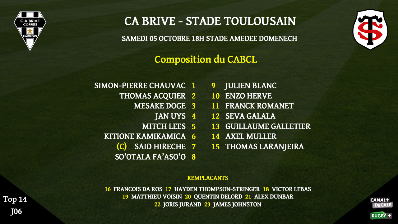Pour cette réception, Brive conserve son équipe à 3 exceptions près dont deux changements sur blessure : Thomas Acquier, Jan Uys et Enzo Hervé sont titulaires à la place de François Da Ros (remplaçant), Peet Marais et Stuart Olding (blessés). Pour le reste, on ne change pas une équipe qui gagne. A noter l'entrée sur le banc de James Johnston, Victor Lebas et Alex Dunbar.