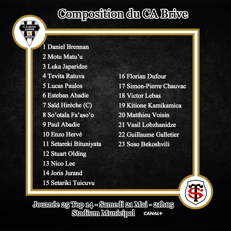 Pour cette réception, Brive doit composer avec des retours mais également des absents de poids. Motu Matu'u fait son retour comme titulaire tout comme Lucas Paulos. Paul Abadie et Enzo Hervé forment la charnière du CAB. Quelques changements sur la ligne de 3/4 : Setareki Bituniyata tient finalement sa place, Stuart Olding est au centre avec Nico Lee. Joris Jurand est à l'aile et Setariki Tuicuvu à l'arrière. Matthieu Voisin et Guillaume Galletier sont remplaçants.