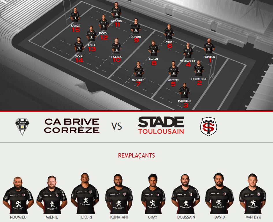 Pour ce déplacement, Toulouse est privé de Guitoune (adducteurs), Baille (genou), Marchand (main), Mauvaka (ischios), R.Gray (dos), Bonneval (genou) Axtens et Kolbe. Titulaire à gauche de la première ligne, Lucas Pointud va faire son retour à Brive
