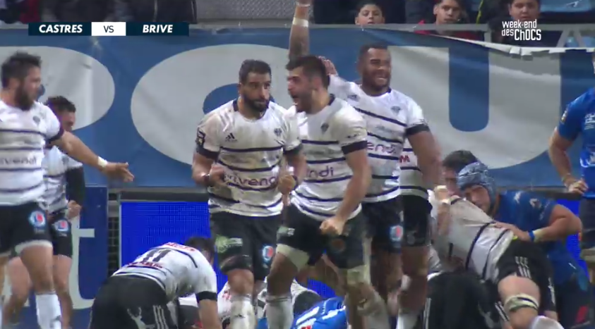 La deuxième période. Avant de revenir aux vestiaires, Julien Blanc avait annoncé la couleur : un match dure 80 minutes, on est bien dans le match, on va revenir. Petit à petit, Brive va grignoter son retard. D'abord grâce au pied de Thomas Laranjeira (qui sera plus à l'aise au moment de son repositionnement à l'arrière) puis grâce à des attaques bien plus tranchantes. Otar Giorgadze puis So'otala Fa'aso'o ont posé bien des problèmes à la défense castraise qui n'a jamais trouvé un moyen pour arrêter le duo (21 courses, 115 mètres, 6 défenseurs battus). Sur le premier essai briviste, Fa'aso'o emporte Benjamin Urdapilleta. Dans l'avancée, la ligne de 3/4 trouve les espaces et Axel Muller marque. La touche a connu des ratés cette saison mais pas sur ce match là. Pénaltouche à 10 mètres, prise de balle de Said Hirèche, le maul avance et termine dans l'en-but. Les brivistes viennent d'infliger un 17-3 aux castrais qui sentent le vent de la défaite à domicile. Malheureusement, cela ne suffira pas pour l'emporter mais au moins, l'équipe toute entière a de quoi construire sur le contenu de cette seconde période. Il y a des imprécisions encore à gommer (option du jeu au pied rasant d'Enzo Hervé, renvoi, discipline) mais Brive est sur la bonne voie.