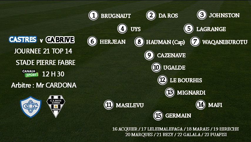 Voici le XV de départ du CA Brive pour le déplacement à Castres :