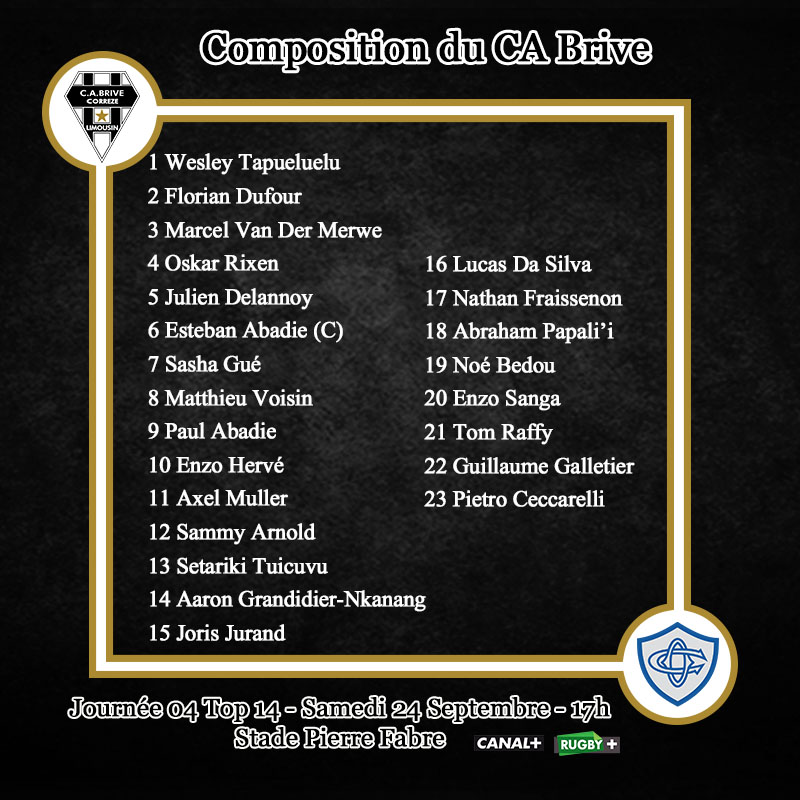 Pour ce déplacement, Brive effectue 8 changements. Florian Dufour est titulaire au talonnage tandis que Marcel Van Der Merwe débute à sa droite. Oskar Rixen va connaitre sa première titularisation en Top 14. Matthieu Voisin prend la place d'Abraham Papali'i au poste de numéro 8. Changement de charnière avec la titularisation de la paire Paul Abadie - Enzo Hervé. Setariki Tuicuvu fait équipe avec Sammy Arnold au centre. Tandis que Joris Jurand est replacé à l'arrière, Axel Muller et Aaron Grandidier-Nkanang sont aux ailes. Première titularisation avec le CAB pour l'international français à VII. Première apparition en Top 14 pour Noé Bedou et Tom Raffy.