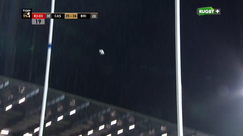 Sur le renvoi, Gérondeau est plus prompt que le bloc de saut briviste. Castres s'offre donc une dernière munition dans cette fin de match irrespirable. Petit à petit, le CO avance et s'approche des 22 mètres brivistes. La pluie s'est abattue sur Pierre Fabre mais le ballon ne tombe pas. Nous sommes au delà du temps réglementaire. Brive ne se met pas à la faute mais Dumora se met en position de drop. Face aux poteaux, le buteur castrais manque la cible et les brivistes se sautent dans les bras pour fêter cette victoire. Mais car il y a un mais, l'arbitre avait signalé une action litigieuse à son arbitre vidéo. Après visionnage, Seva Galala est sanctionné pour un plaquage haut. Julien Dumora a de nouveau la chance d'offrir la victoire aux siens. Cette fois, l'arrière castrais ne manque pas la cible et crucifie le CAB qui est passé par toutes les émotions en quelques minutes (28-26, 80'). Quelle fin déchirante pour le CAB qui aurait fait une excellente opération avec cette première victoire à l'extérieure de la saison.