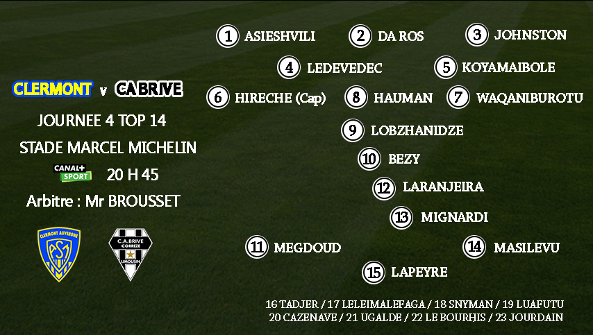 Voici le XV de départ du CA Brive pour le déplacement à Clermont :