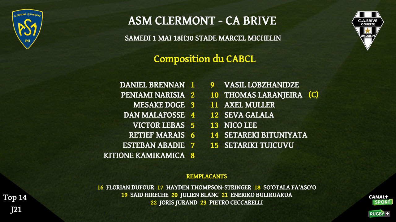 Voici le XV de départ du CA Brive pour le déplacement à Clermont :