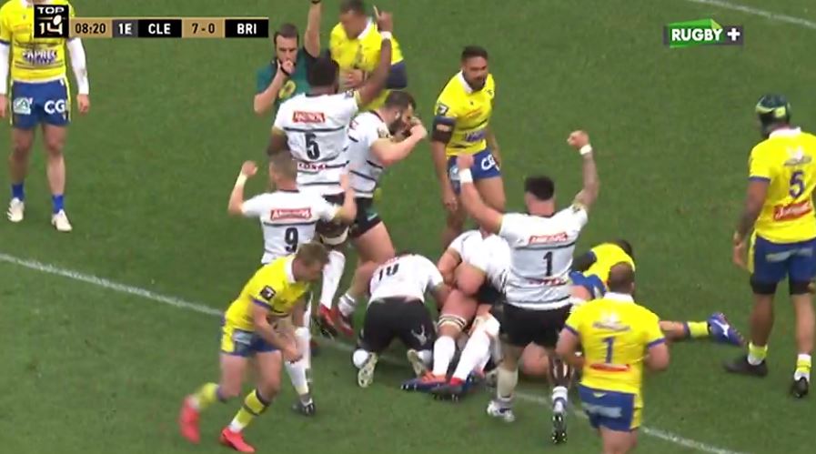 Le derby ne commence pas de la meilleure des façons pour Brive. A peine le temps de se réchauffer que Clermont franchit déjà la ligne. Brive déclenche un maul mais va se faire arracher la balle sur ses 22 mètres. C'est vite écarté par l'ASM, Damian Penaud fixe la défense et sert Aliveriti Raka qui marque en coin (7-0, 3'). Quelques minutes plus tard, il y a de la casse à Brive. Si Esteban Abadie quitte momentanément la pelouse pour un saignement, c'est plus sérieux pour Thomas Laranjeira, touché à l'épaule après un contact avec Giorgi Beria. Le briviste doit céder sa place à Wesley Douglas (7'). Mais le CAB va bien réagir. A la suite d'une touche à 5 mètres, Retief Marais assure la prise et transmet à So'otala Fa'aso'o. Comme face à Castres, le numéro 8 fait parler sa puissance et franchit la ligne (7-5, 9').