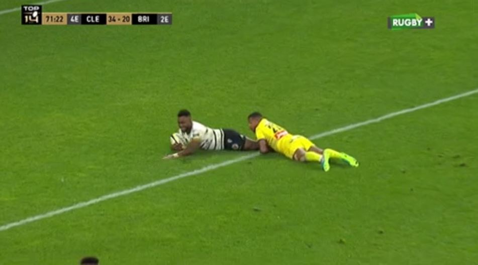 Si cet essai était un peu confus, le suivant ne le sera pas ! Brive lance l'attaque depuis ses 22 mètres. Eneriko Buliruarua passe les bras et lance Nico Lee dans l'intervalle. Le centre sud-africain déchire le rideau et avance jusqu'aux 40 mètres adverses. Julien Blanc est au relais et sert immédiatement Setariki Tuicuvu qui conclut cette relance dans l'en-but adverse (34-27, 72').