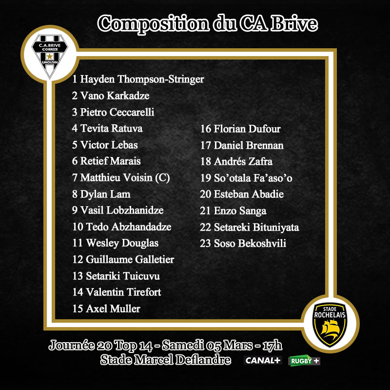 Pour ce déplacement, Brive fait tourner son groupe. Vano Karkadze et Pietro Ceccarelli sont titulaires en première ligne. Victor Lebas retrouve une place de titulaire en 2e ligne. Matthieu Voisin et Dylan Lam sont de retour en 3e ligne. Charnière géorgienne avec Vasil Lobzhanidze et Tedo Abzhandadze. Si la paire de centres ne change pas, à côté si avec Wesley Douglas et Valentin Tirefort aux ailes et Axel Muller replacé à l'arrière. A noter le retour de blessure de Florian Dufour sur le banc.