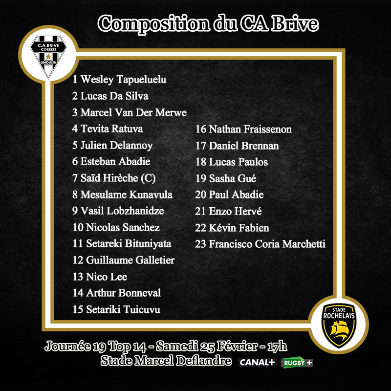 Voici le XV de départ du CA Brive pour le déplacement à La Rochelle :