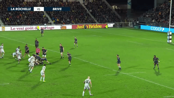 La Rochelle revient à la charge et la défense corrézienne se met en position de hors-jeu. Lamb égalise pour son égalise (10-10, 23'). Après un début de match compliqué, le Stade Rochelais est rentré dans sa rencontre et commence à se montrer dangereux en attaque. Les rochelais ont décidé d'accélérer. La Rochelle charge et s'écroule sur la ligne. L'action repart sur une mêlée. Kerr-Barlow charge à quelques mètres de la ligne mais il est stoppé. La Rochelle fixe la défense à l'intérieur avant d'en profiter à l'extérieur. Ryan Lamb distille un très beau jeu au pied dans le dos de la défense pour Roudil qui aplatit en coin (15-10, 35'). Les maritimes insistent. Kerr Barlow déchire le rideau et est stoppé sur les 22. Mike Tadjer commet une faute grossière et écope d'un carton jaune. Lamb augmente l'avance de son équipe (18-10, 38'). Sur une touche, Alldritt est lancé comme un frelon, La Rochelle gagne 50 mètres sur l'action. Et à nouveau, après une fixation de la défense, Lamb alerte au pied son aile gauche et c'est Eaton qui aplatit en coin à la sirène (23-10, 40'). Brive a montré un très beau visage pendant une bonne partie de la période avant de s'écrouler en toute fin. La Rochelle a parfaitement su accélérer quand il le fallait.