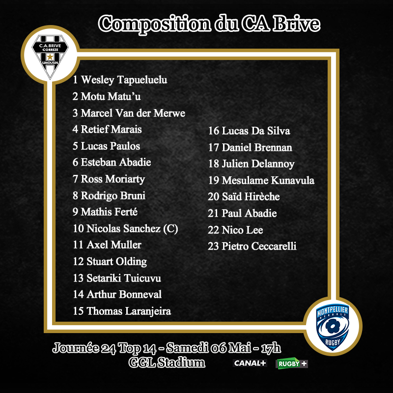 Voici le XV de départ du CA Brive pour le déplacement à Montpellier :
