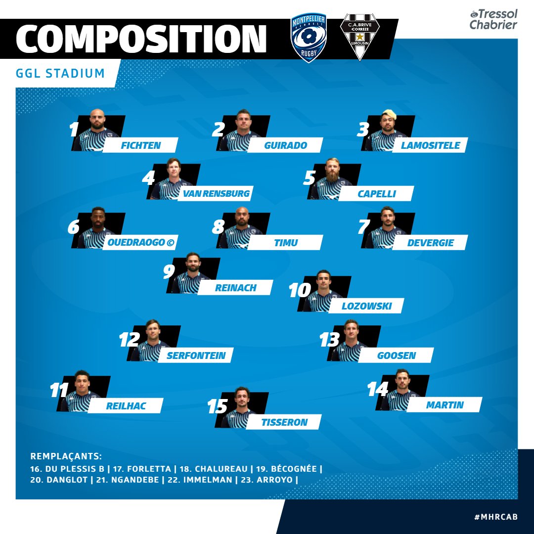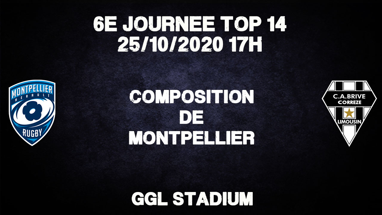 Pour la réception de Brive, Montpellier ne peut compter sur Giudicelli (épaule), J.Du Plessis (orteil), Verhaegue (épaule), Galletier (commotion), Picamoles (cuisse), Paillaugue (adducteurs), Pollard (genou), Camara (suspension), Haouas, Willemse, Vincent, Rattez et Bouthier (sélection France), Nariashvili et Aprasidze (sélection Géorgie).