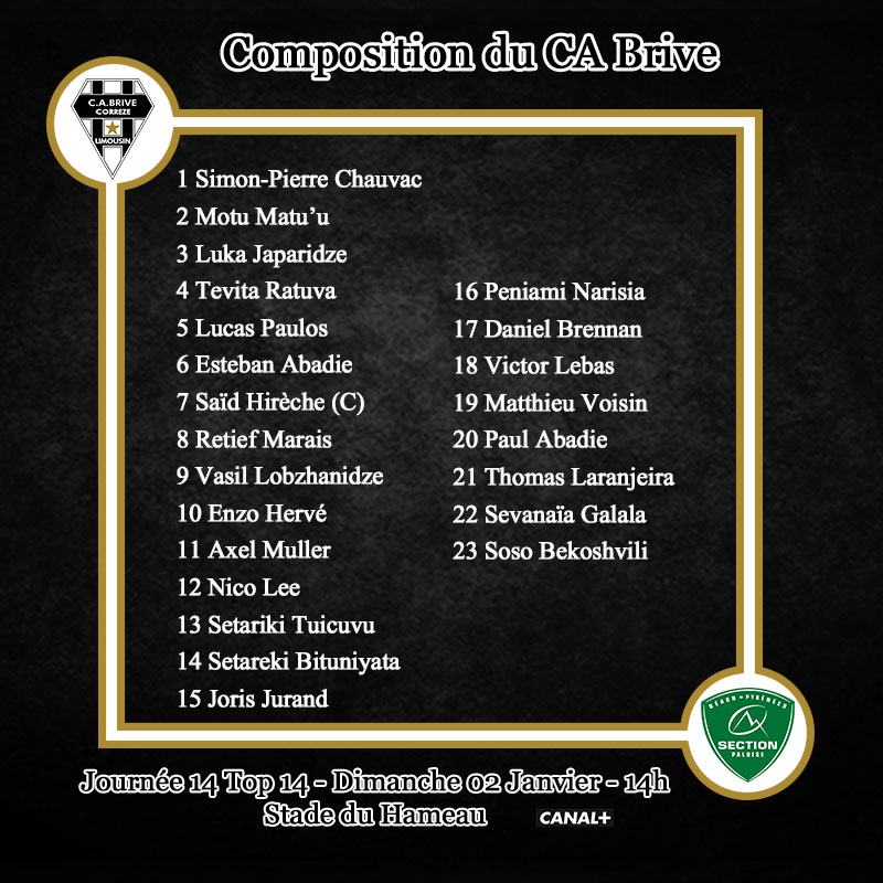 Voici le XV de départ du CA Brive pour le déplacement à Pau :