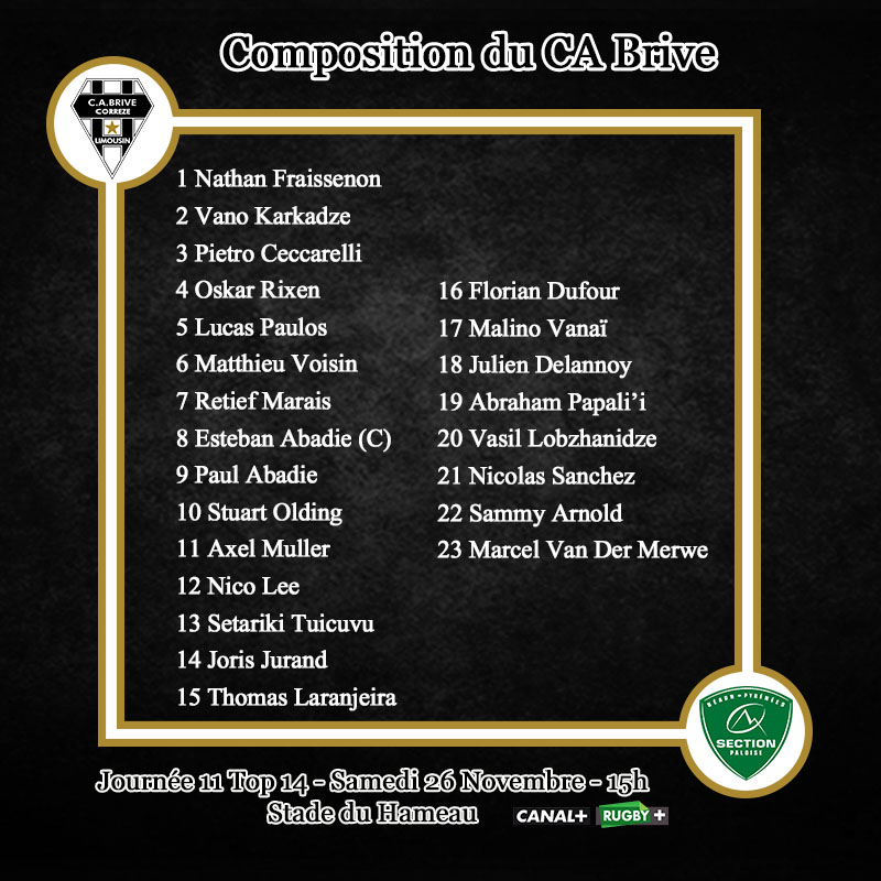 Pour ce déplacement, Brive change pas mal de choses. Nathan Fraissenon est titulaire en première ligne à côté de Vano Karkadze et Pietro Ceccarelli. Oskar Rixen fait équipe avec Lucas Paulos. Retief Marais est de retour au jeu et est titulaire pour son premier match. Paul Abadie et Stuart Olding forment la charnière. De retour de blessure, Nico Lee est avec Setariki Tuicuvu. Banc solide avec Marcel Van Der Merwe, Abraham Papali'i, Vasil Lobzhanidze, Nicolas Sanchez et Sammy Arnold.