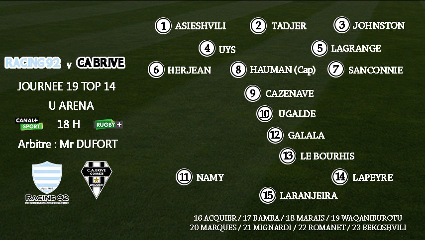Voici le XV de départ du CA Brive pour le déplacement au Racing :