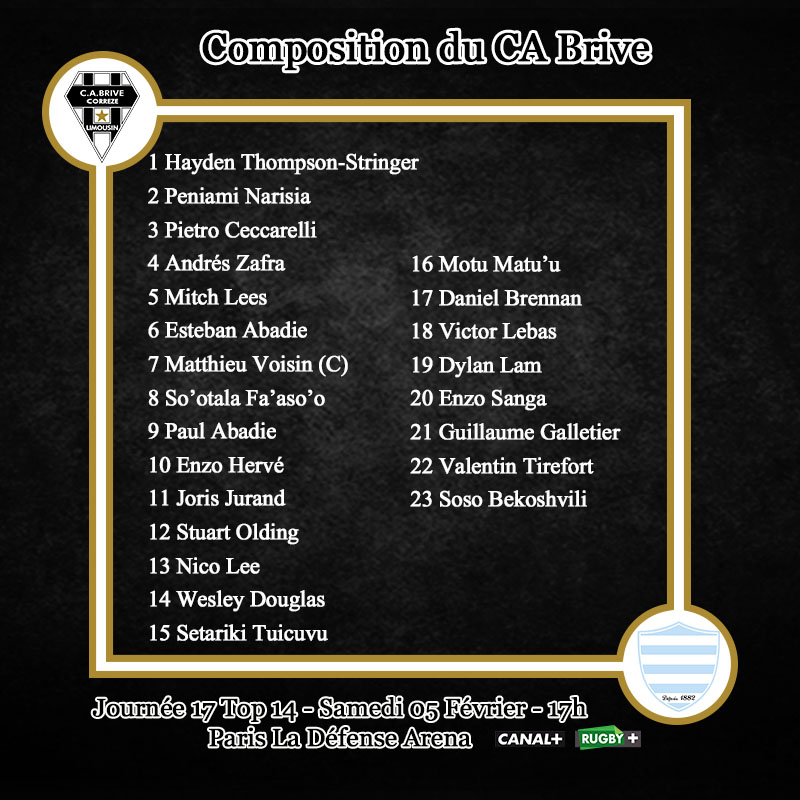 Voici le XV de départ du CA Brive pour le déplacement au Racing 92 :