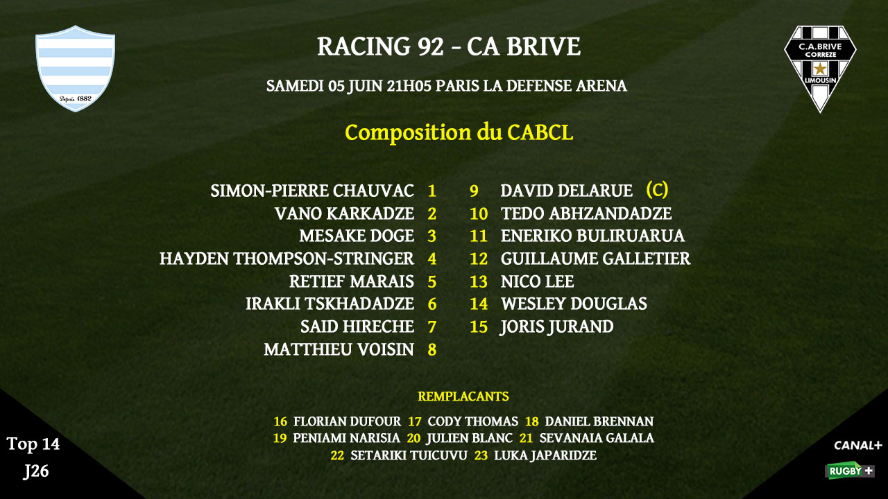 Voici le XV de départ du CA Brive pour le déplacement au Racing 92 :