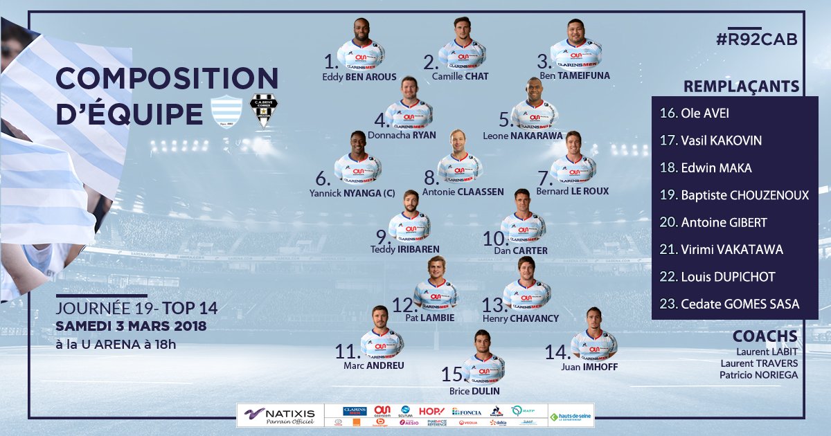 Pour cette réception, le Racing ne comptera pas sur Thomas (cheville), Machenaud, Lauret, Szarzewski, Ducalcon, Albacete, Carizza, Laulala, Tuitavake.