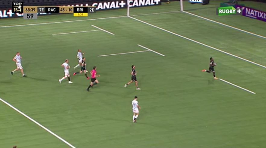 Pas le temps de savourer que le Racing 92 reprend son bonus offensif. Finn Russell bonifie un ballon de récupération en alertant Gaël Fickou. Ce dernier fixe et sert Teddy Thomas qui sprinte pour aplatir en coin (26-5, 34'). Malgré l'écart, Brive est mieux et relève la tête avec son XV plus que remanié. Juste avant la pause, l'indiscipline du Racing l'oblige à défendre sur une touche à 5 mètres. Si Saïd Hirèche parvient à contrôler le lancer de manière assez acrobatique, le maul va se faire enterrer par les avants du Racing 92. A la pause, le Racing est dans les clous de son objectif, à savoir une victoire bonifiée. Brive a connu une entame très compliquée mais a mieux paru en fin de première période avec notamment l'essai de son pilier droit.