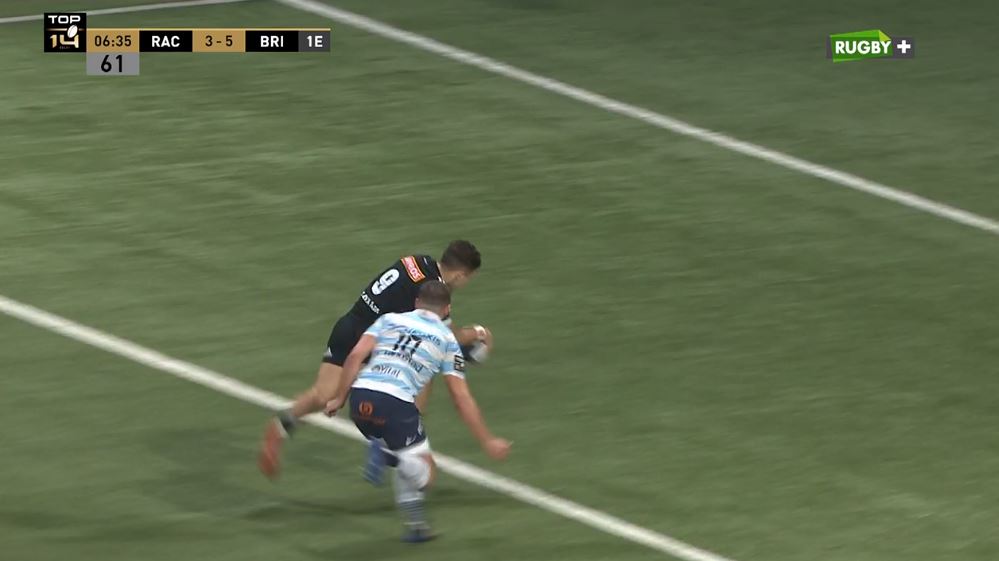 Dès l'entame de match, le Racing 92 confisque le ballon et se montre pressant aux abords des 22 mètres brivistes. La défense est bien en place dans l'axe, Antoine Gibert tente d'écarter sur son aile droite mais sa passe termine en touche (1'). Brive réagit et parvient à enchainer les passes. Motu Matu'u trouve un espace et s'y engouffre. Malheureusement, un en-avant au sol est commis. Sur la mêlée, Brive est pénalisé et à presque 50 mètres, Gibert ouvre le score (3-0, 5'). Les conditions de jeu de l'Arena se prêtent au jeu alors jouons ! Esteban Abadie est en position d'ailier et efface Louis Dupichot. Le 3e ligne déborde et sert à son intérieur Léo Carbonneau qui casse le plaquage de Nolann Le Garrec avant de filer vers l'en-but malgré un dernier plaquage de Gibert, en vain (3-7, 7').
