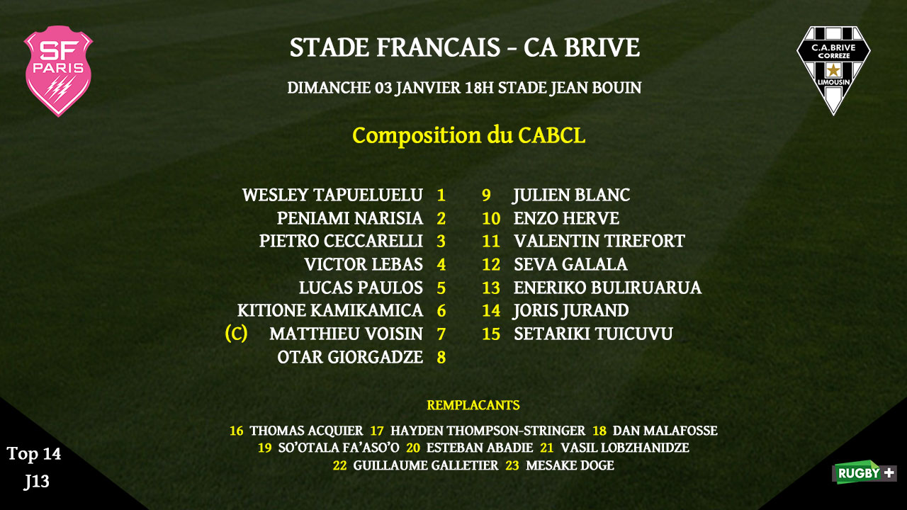 Voici le XV de départ du CA Brive pour le déplacement au Stade Français :
