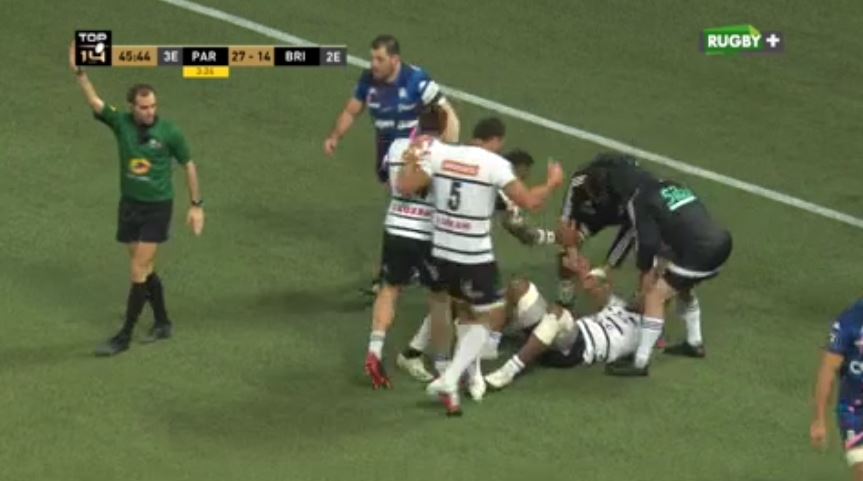 Brive décide d'enflammer cette fin de période. Derrière une touche rapidement jouée, la contre attaque est lancée plein axe et le ballon arrive rapidement dans le camp parisien. Veainu se met volontairement à la faute, carton jaune pour l'ailier parisien (39'). A la sirène, Brive va en touche et va tenter de recoller en force. Malheureusement, un en-avant vient stopper ce temps fort, on s'est un peu trop précipité sur ce coup là. Après avoir subi en début de rencontre, Brive a bien réagi dans les dernières minutes pour ne tourner qu'avec 10 points de retard. Par contre, il va falloir stopper la distribution de cadeaux, Paris n'en demande pas tant.